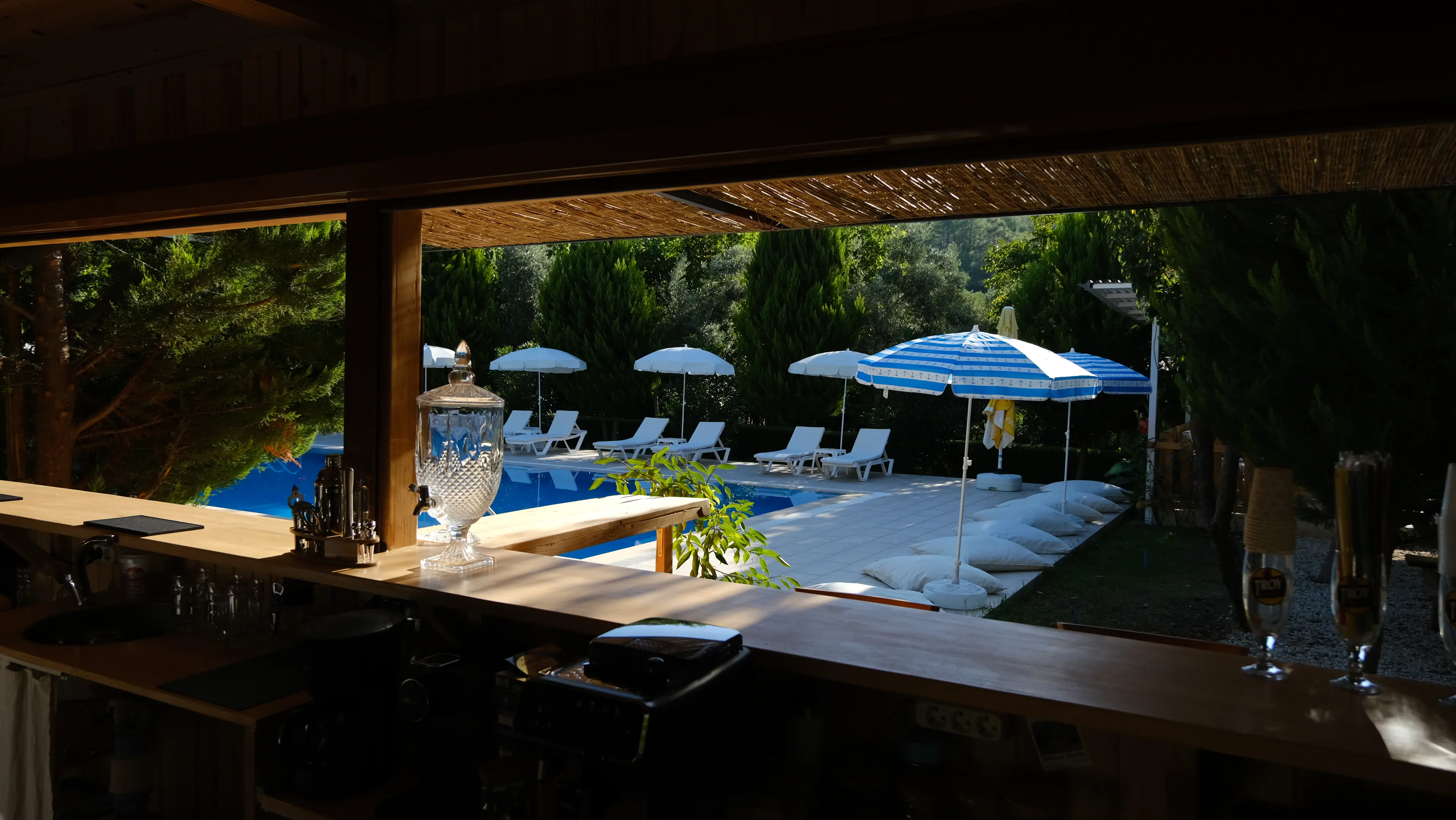 Havuzun mavi serinliğiyle buluşan bar, güneşin altın ışıkları altında parlayan egzotik içecekleri ve huzurlu atmosferiyle büyüleyici bir keyif sunuyor.